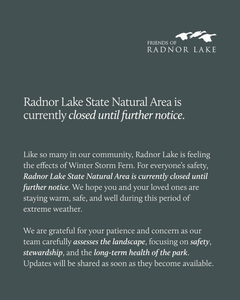 We appreciate your patience, understanding, and continued support as recovery efforts continue at Radnor Lake State Natural Area. As thawing progresses, significant damage has been identified throughout the park, including numerous downed trees and large limbs. Cleanup efforts are currently underway, and full recovery will take time as our team address ongoing instability and safety concerns.